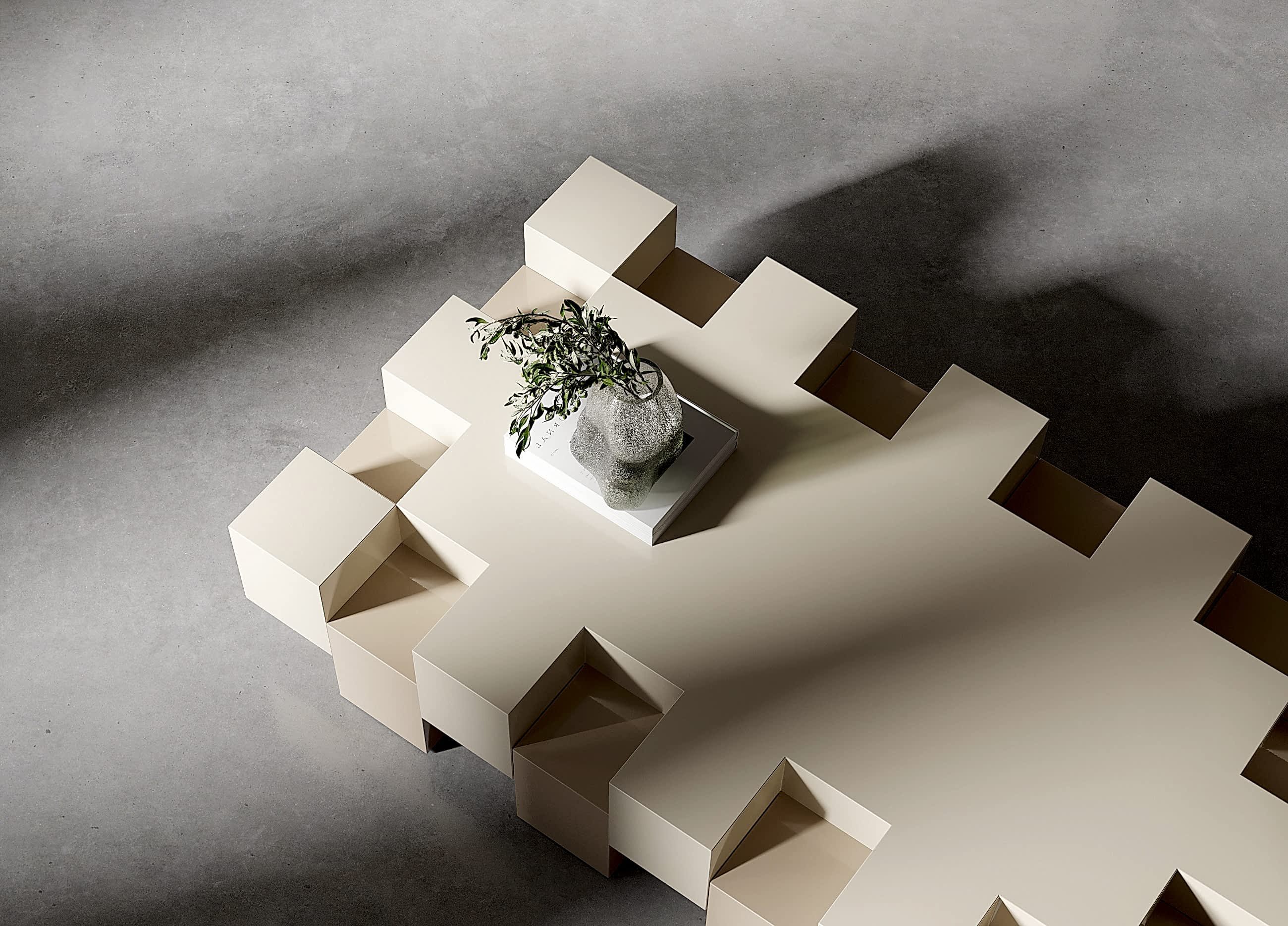 Ön planda yer alan Pinco Sehpa, kubik yapısıyla ışık ve gölge oyunlarına alan tanıyor. Parçalı tasarımı sayesinde hem işlevsel hem de estetik bir obje olarak öne çıkıyor.