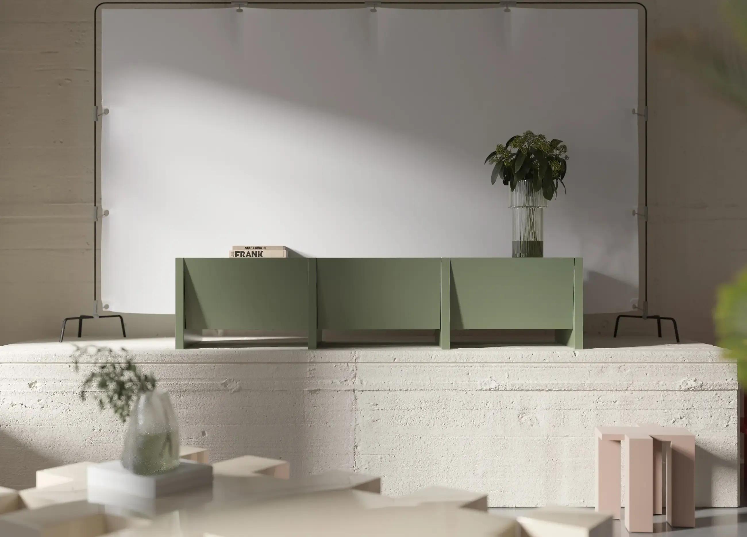 Arka plandaki Bevel ünite, ferahlık hissi uyandırırken nötr tonlarla uyum içinde çalışıyor. Doğaya atıfta bulunan bu renk, Pinco ama güçlü bir atmosfer yaratıyor.